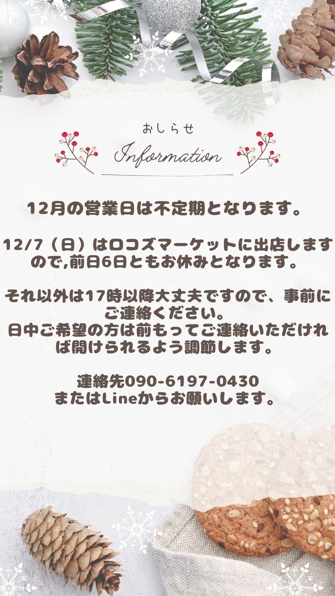 ご来店の際は不在の時間帯もございますので、事前にお電話(090-6197-0430)いただけますと幸いです。